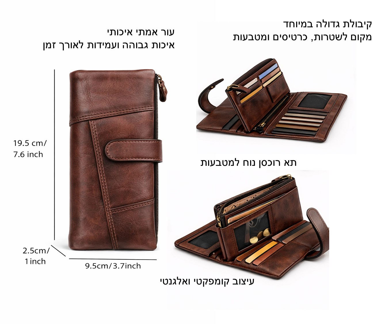 ארנק עור אמיתי לנשים עם מקום ל־12 כרטיסים, לשמירה מסודרת ונוחה של כל מה שחשוב. תא רוכסן למטבעות מונע איבוד ומקל על שימוש יומיומי. עור איכותי ועמיד-מראה אלגנטי לאורך זמן ותמורה מצוינת.