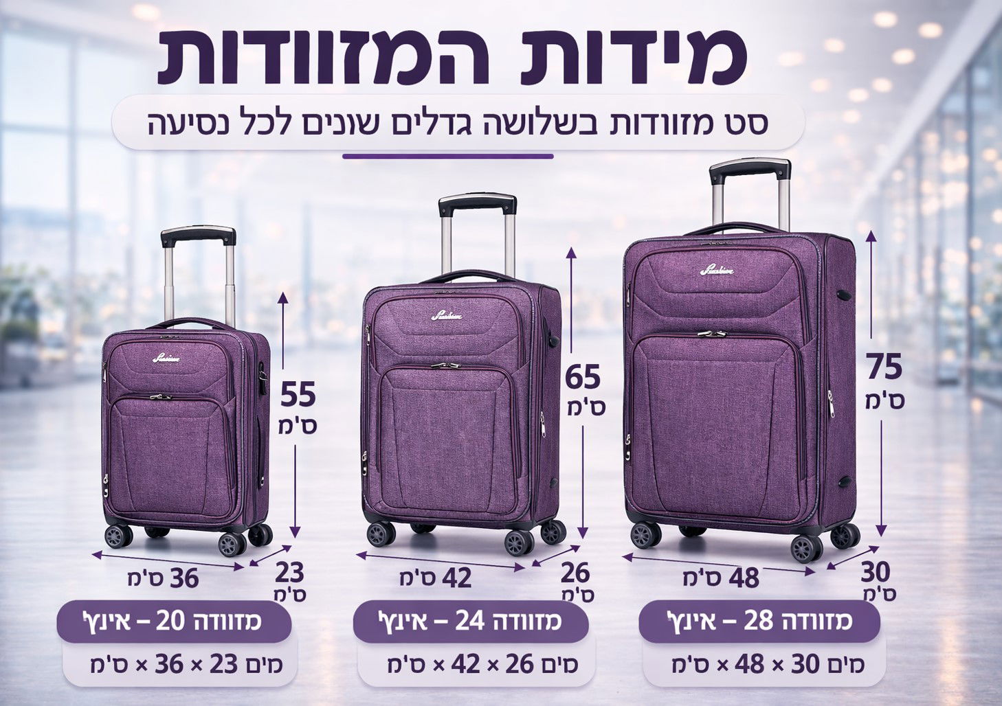 🧳 סט מזוודות טיול יוקרתי בגוון סגול אפרפר בעיצוב מודרני