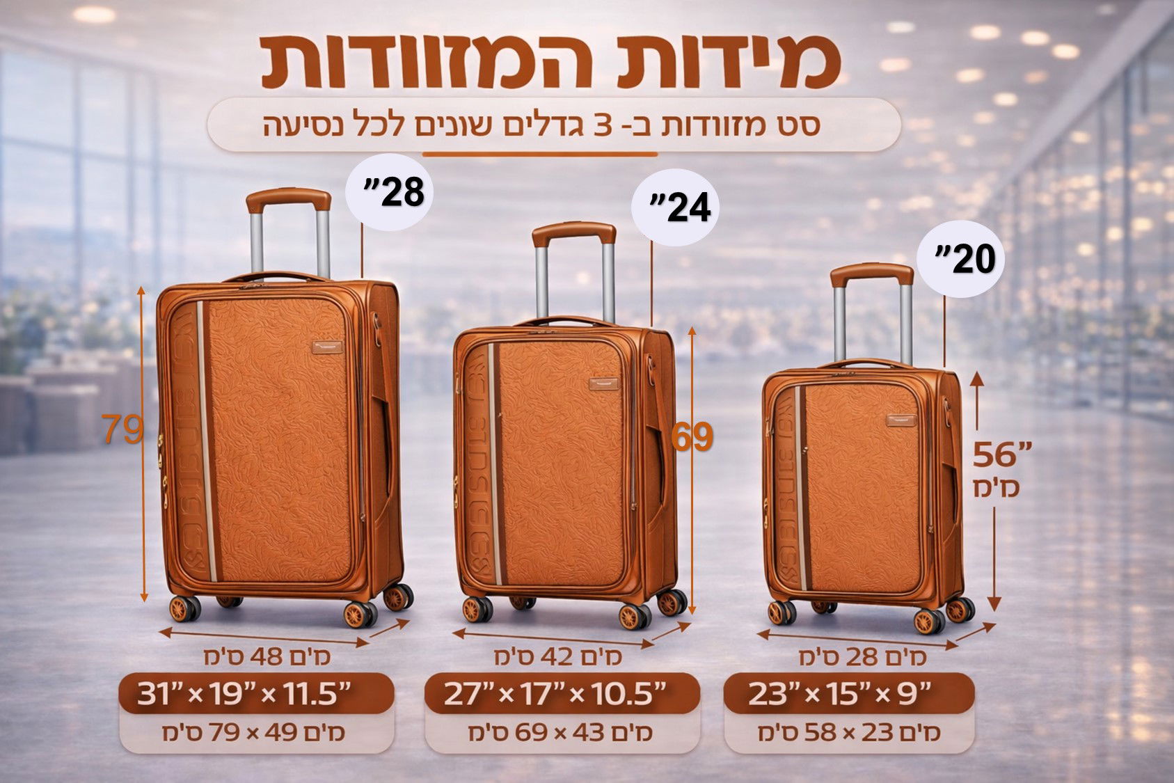 שדרגו את חוויית הנסיעה שלכם כבר היום סט מזוודות איכותי בצבע כתום ייחודי ומרשים, מושלם לכל סוגי הנסיעות – חופשות, עבודה וטיולים ✈️ ✔️ קל משקל ונוח לנשיאה ✔️ גלגלים 360° לתנועה חלקה ✔️ רוכסן ראשי כפול חזק ובטיחותי ✔️ בד איכותי ועמיד ✔️ ניתן להרחבה – נפח אחסון גדול ✔️ חלוקה פנימית נוחה ומסודרת