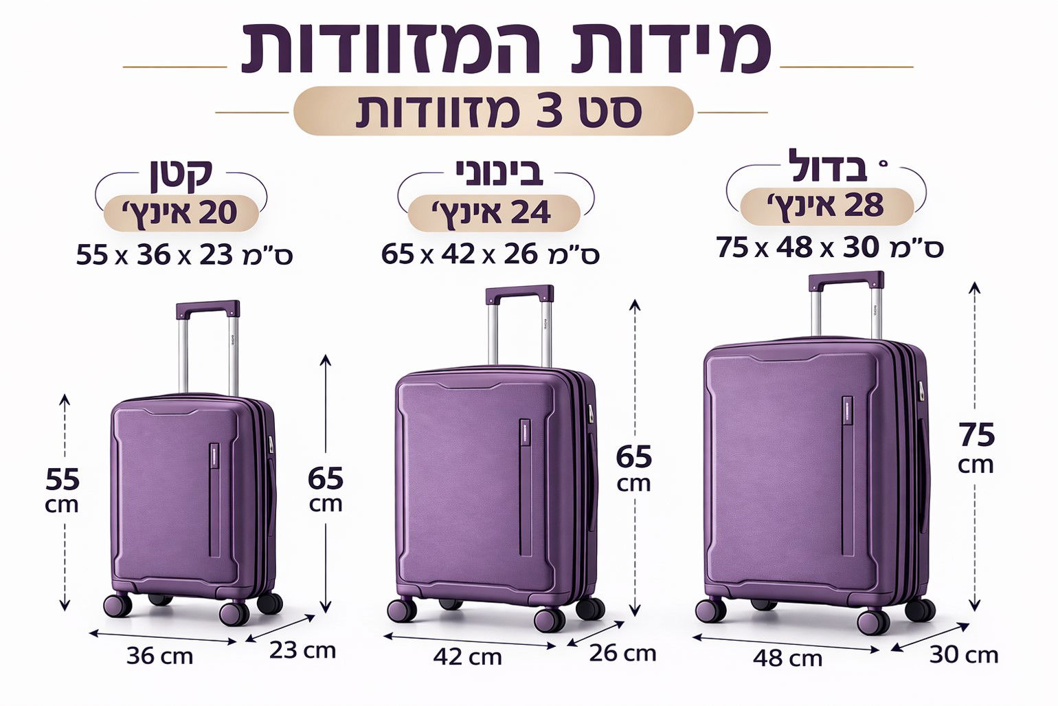 בחרו סט מזוודות 3 יחידות בלתי שביר פוליפרופילן BEGNELEON כדי ליהנות מעמידות לאורך זמן ושקט נפשי בדרך. שימוש יומיומי ונסיעות תכופות הופכים לפשוטים יותר, עם שילוב של איכות, גמישות וחיסכון במקום ואחסון. אחריות 12 חודשים בחנות עולם התיקים בע"מ